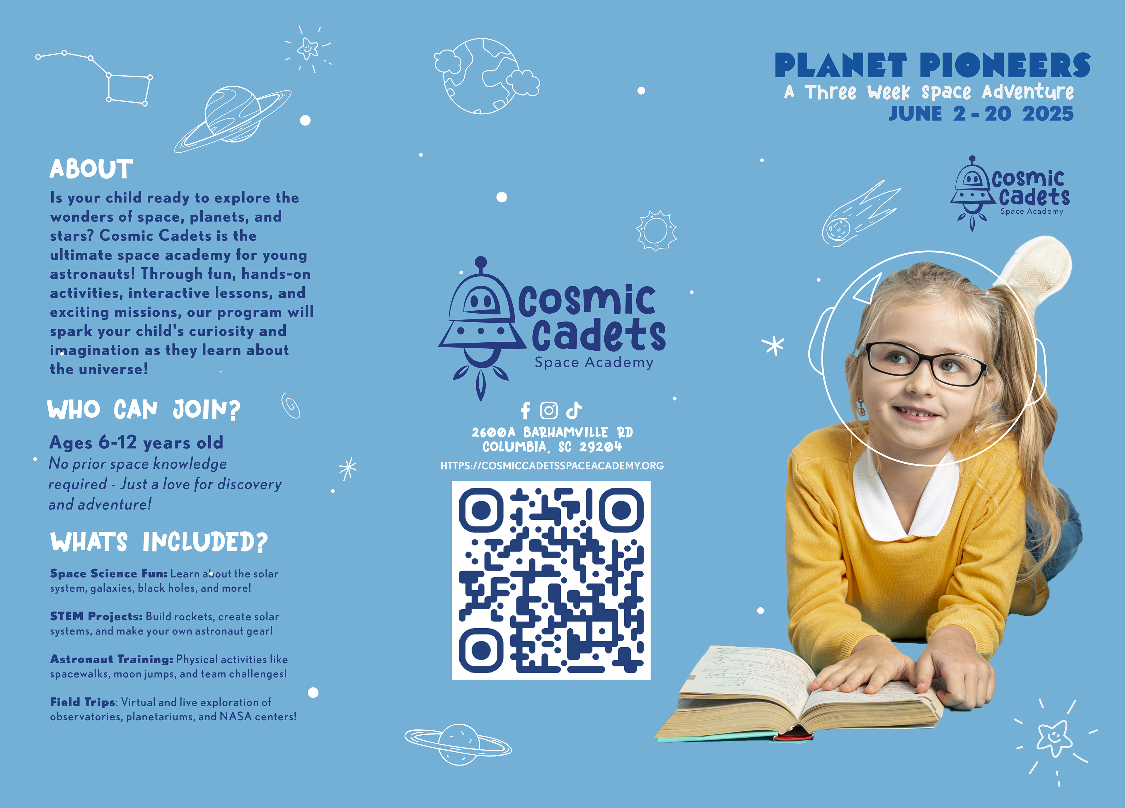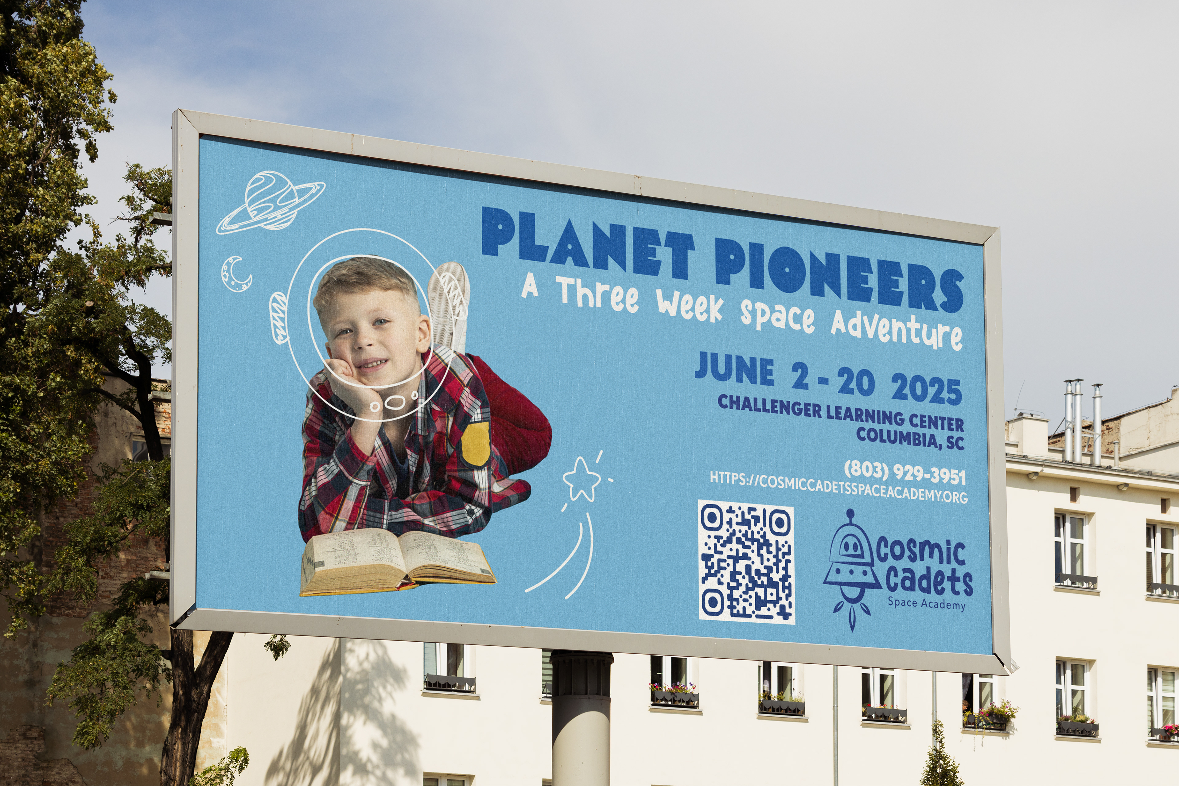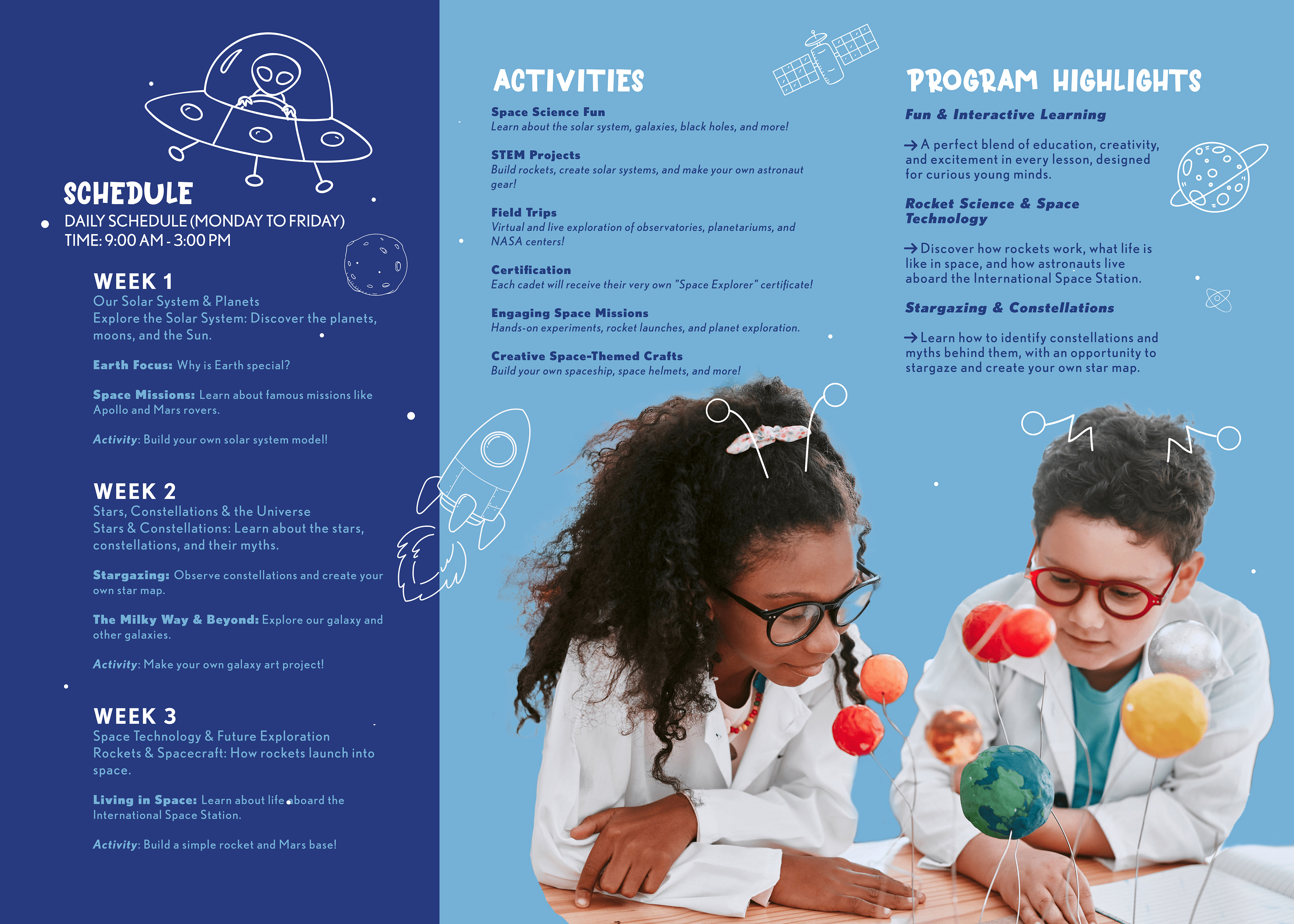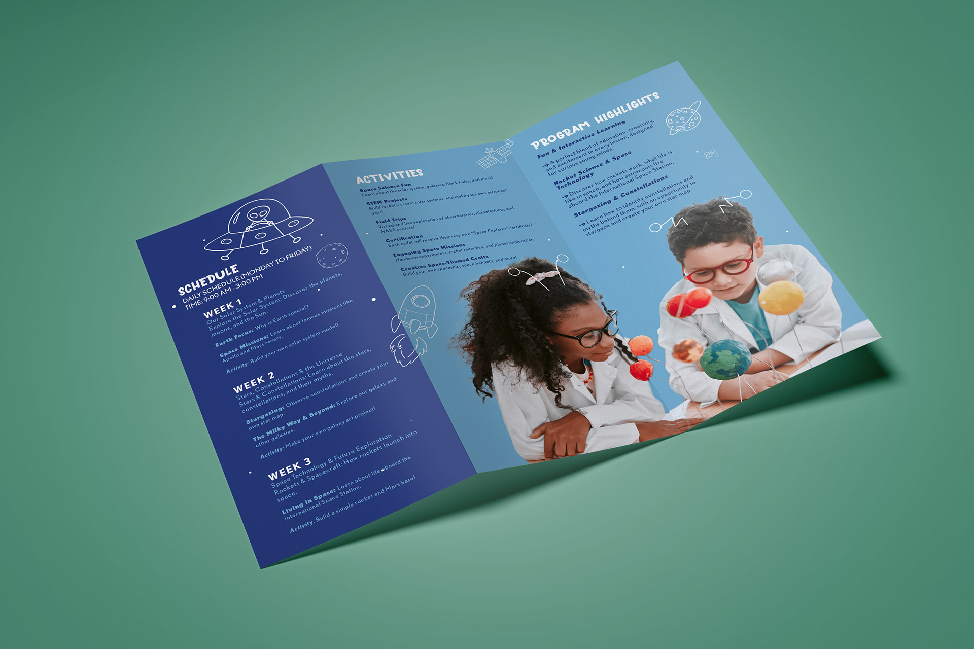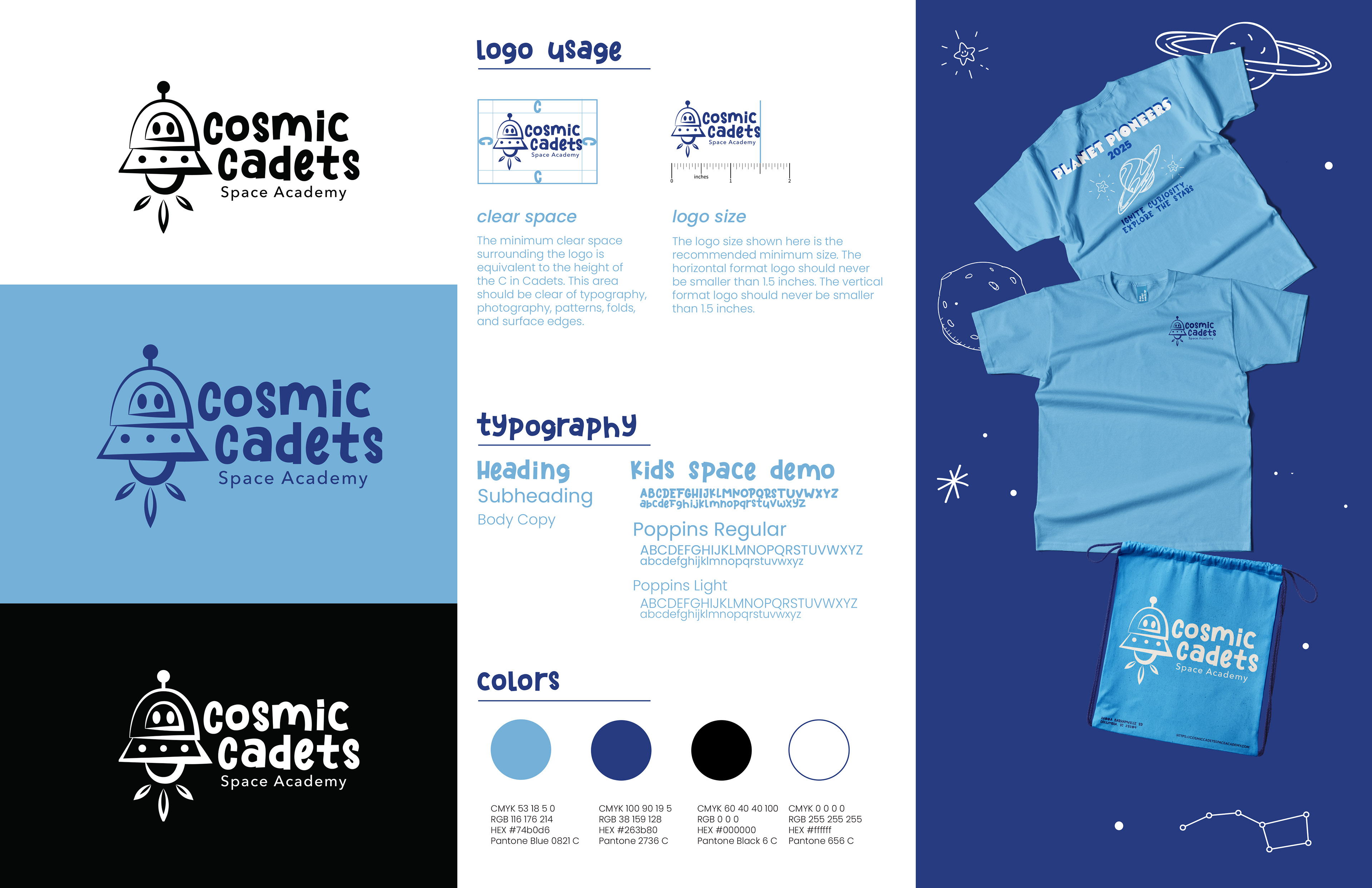 A full brand identity spread and logo designed for a kid’s space program where campers have the opportunity to learn about space through interactive and first hand projects. The design focuses on fun, creativity and being family friendly.
