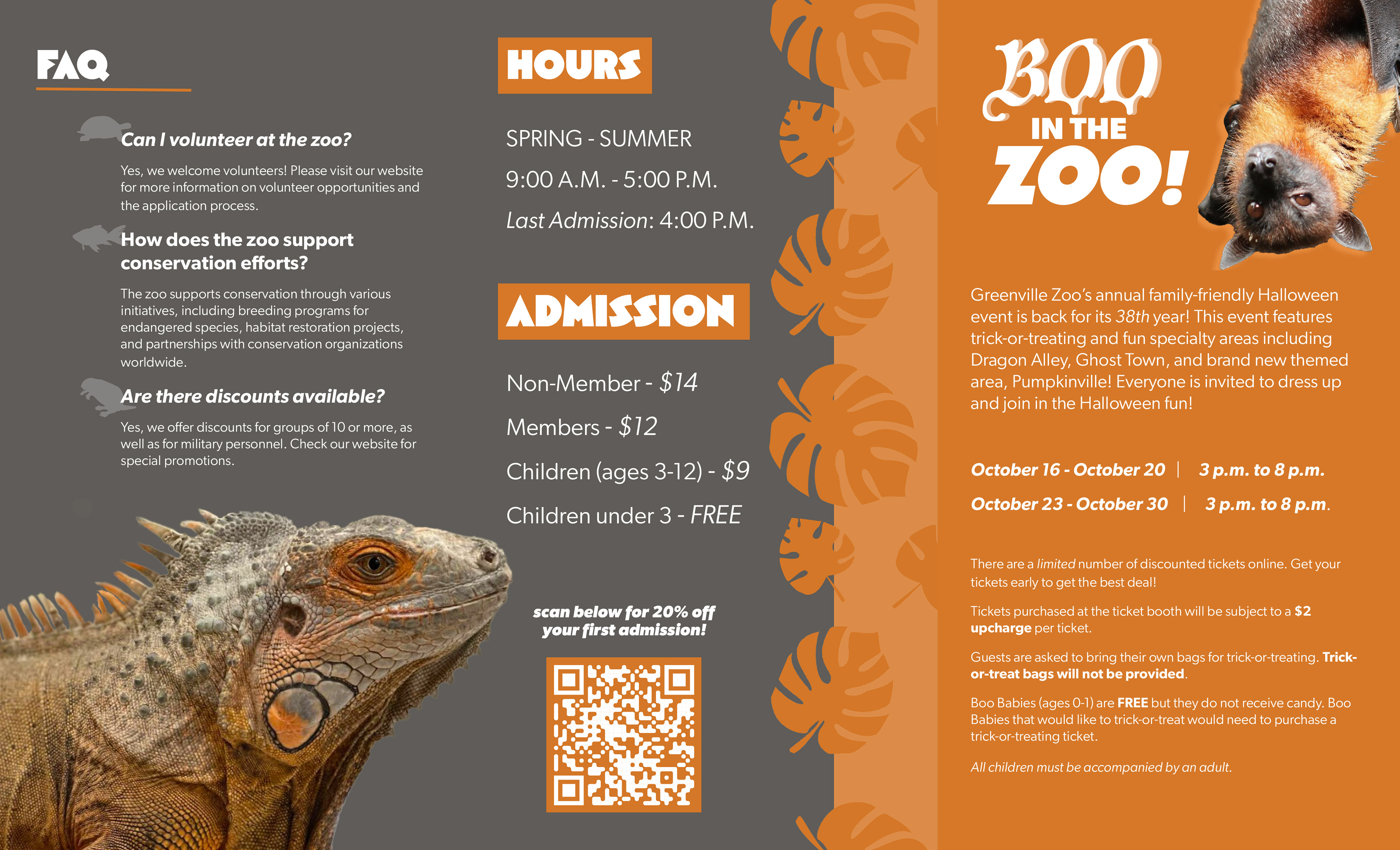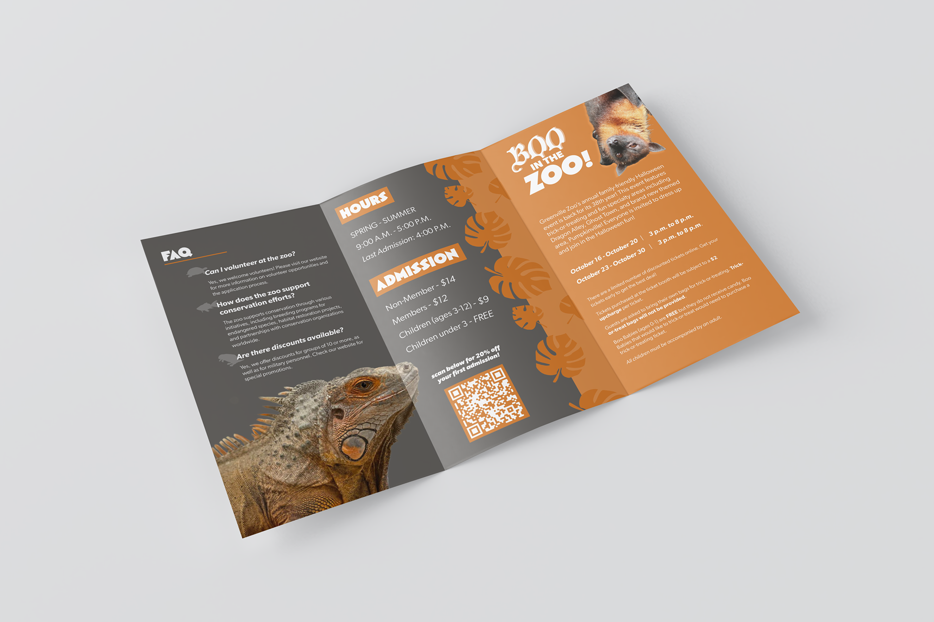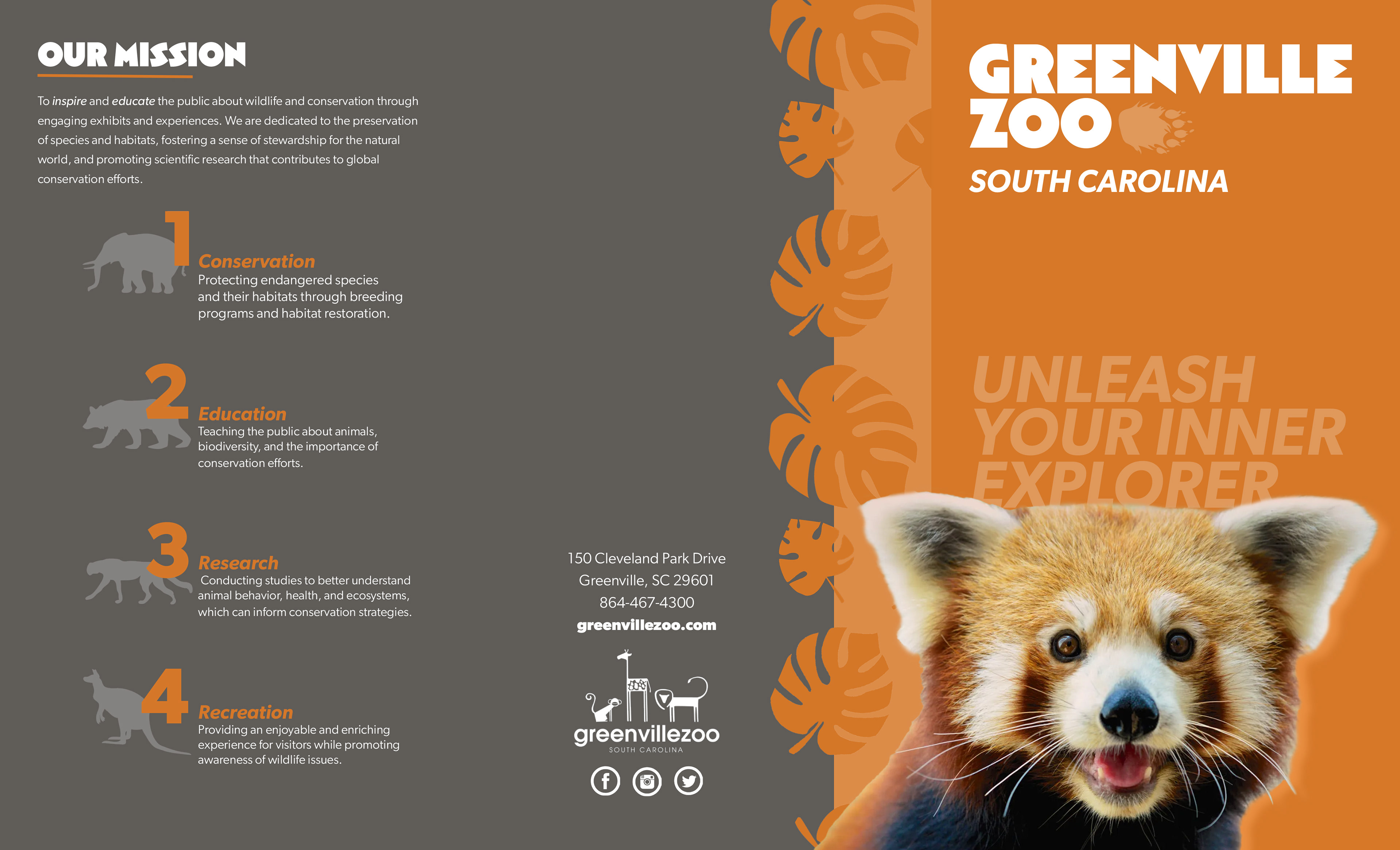 A brochure designed to delve into the different activities, exhibits, pricing, and featured events of the Greenville Zoo in a visually captivating way.