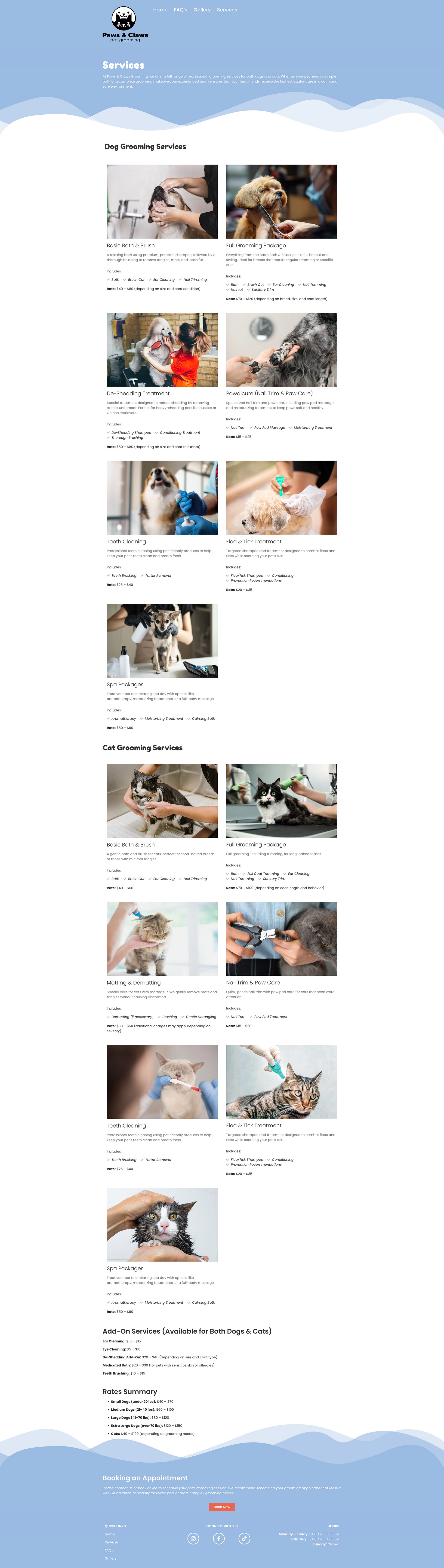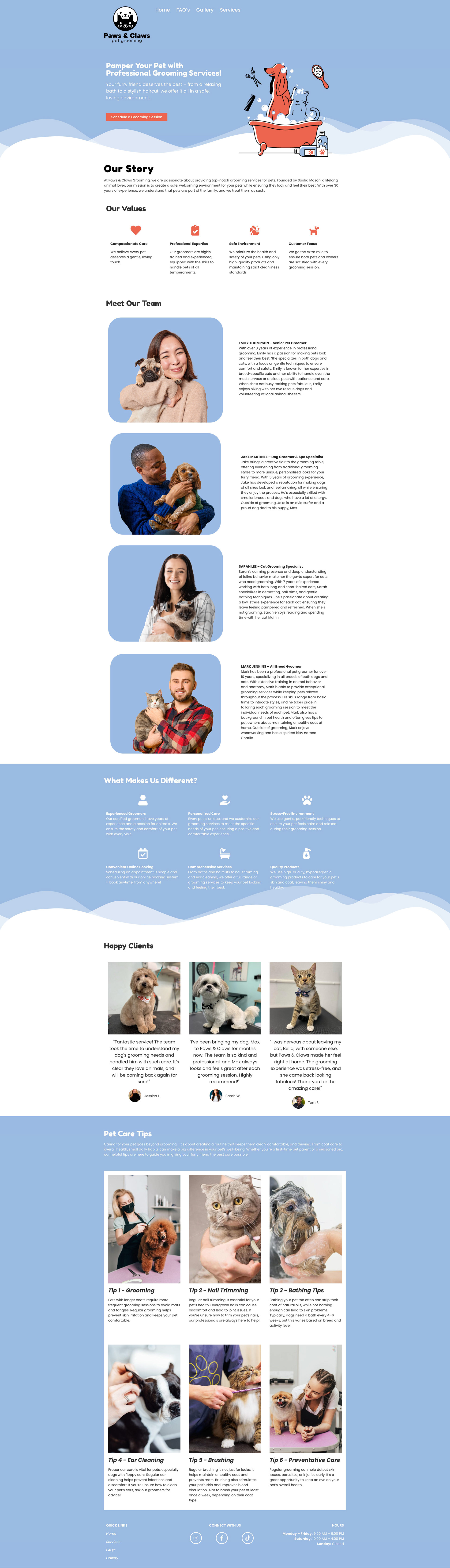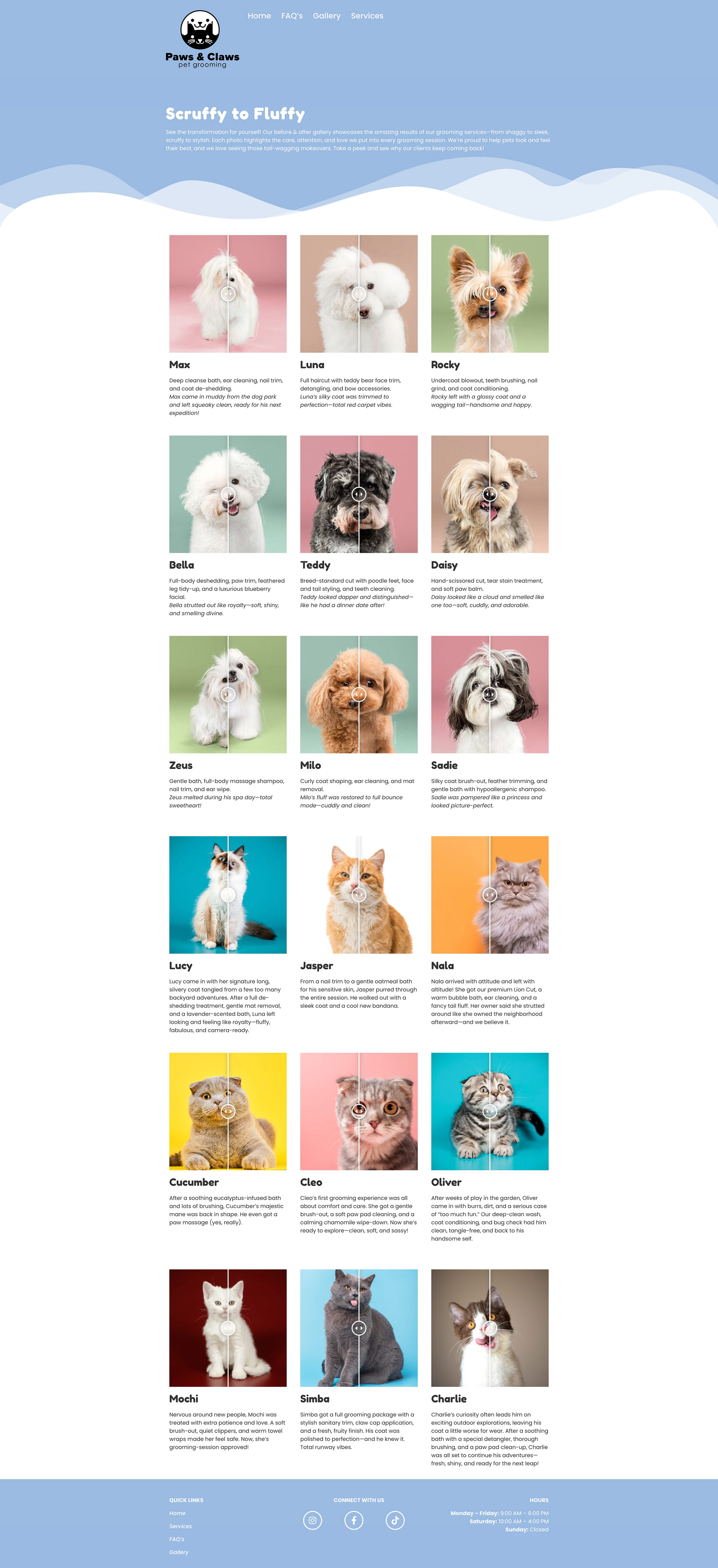 A website designed for a pet grooming company. The goal of the design was to keep with the colors of the brand while creating a professional yet fun and inviting feel to draw in more clientele.